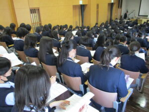 まず、進路担当の先生から、高校3年間のカリキュラム表をもとに選択履修の注意事項、選択教科決定までの今後の予定について説明がありました。次に、各教科担当の先生方から、学習内容の説明、履修すべき人の特徴、今後の学習に対する姿勢などについてお話頂きました。
