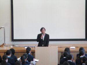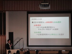 いよいよ受験生となる高校3年生の授業選択を行っていく上での心構え、各教科の学習内容等について進路担当の先生や教科主任の先生方からお話を頂きました。