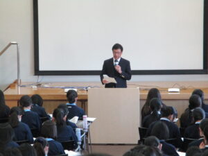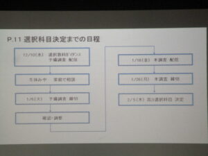 いよいよ受験生となる高校3年生の授業選択を行っていく上での心構え、各教科の学習内容等について進路担当の先生や教科主任の先生方からお話を頂きました。