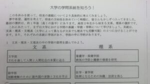本校では、進路選択の1つ目が高校1年生から2年生になるときに選択する、文系・理系の選択です。それぞれ、文系・理系のどちらになるのかな、どのような学問なのかなという生徒の思う疑問を、問題形式で解説していきました。