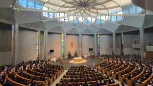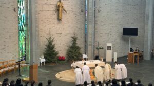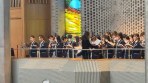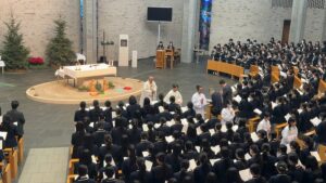 荘厳な教会堂に響く聖歌とともに、生徒たちは聖書の朗読に耳を傾け、神父様のお話を通して、クリスマスの本来の意味について改めて考えるひとときを過ごしました。静かな祈りの時間の中で、日々の生活や周囲の人々への感謝の気持ちを心に刻む、貴重な機会となりました。