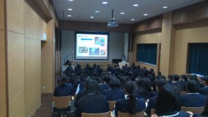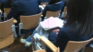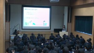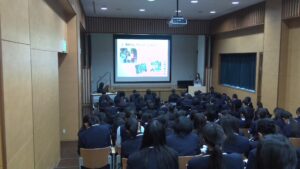 竹内先輩は、本校の卒業生であり、現在大学4年生です。中学高校の時期をセシリアで過ごしたことに想いを起こし、高校生活は自分の夢につながる時間で、今からでも高校生活への希望を持ってほしい。高校生活やこれからの人生は「選択の連続」なのであり、①未来の自分のために可能性を広げ、②部活動や委員会活動を楽しんでみることが大切だとお話されました。