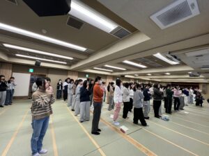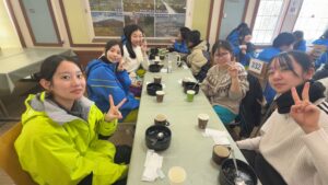 朝礼では、本日の流れや荷物発送、帰路の予定について確認を行い、その後、朝食をとりました。朝食後はいよいよ、この実習の締めくくりとなる最後のスキー、スキーバッジテスト(検定試験)に臨みました。