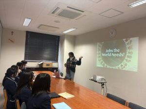 今回は、世界で起きているさまざまな問題を解決するために必要な職業について調べ、さらに新しい職業を考案し、英語で発表を行いました。