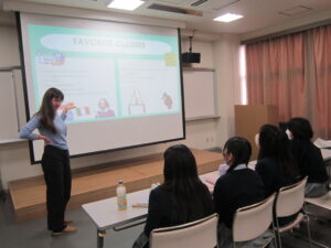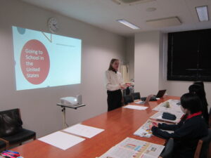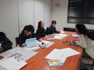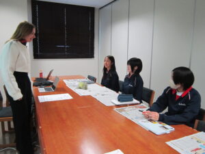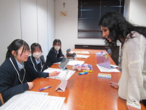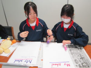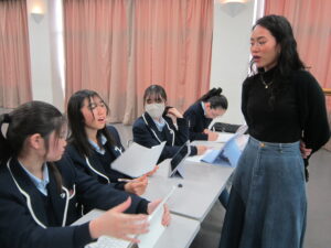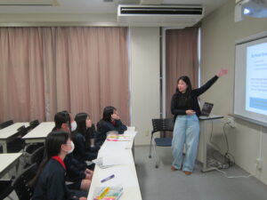 2026.01.28 ブログ 教科【英語】中1 グローバルワークショップ中学1年生では、本年度3回目となるグローバルワークショップを実施しました。イギリス、ウクライナ、フランス、マレーシア、フィリピン出身の留学生の方々をお迎えし、生徒たちは自分の学校の良いところとその理由を英語で発表しました。セシリアの雰囲気や行事、授業についてなど、アドバイスをいただきながら英文を作成し、しっかりと伝えることができました。一生懸命に取り組む生徒たちの姿がとても印象的でした。