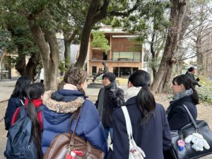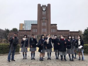 2026.02.07 ブログ 土曜講座東京大学キャンパスツアーに行きました!グローバルプログラム(フリートークデイ・グローバルワークショップ)でお世話になっている東京大学院生のVITOR YAMANAKAさんに東京大学を案内していただきました。農学部、安田講堂、三四郎池など英語で説明していただき、皆楽しく過ごすことができました。残念ながら赤門は工事中でしたが、それも珍しいことなので集合写真を撮りました。子供たちが大学生活に触れられる良い機会となりました。