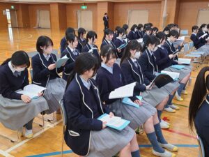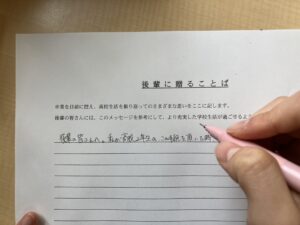 教室に戻った後は「後輩に送ることば」を後輩の生徒たちに向けて書きます。後輩を思う優しい生徒たちが集まる本校ならではの伝統儀式の一つです。