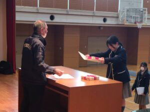 最後に卒業生の生徒たちから、お世話になった先生方へ卒業記念の品をプレゼントです。今年のプレゼントはポロシャツでした!夏の暑い時期に仕事でも着られるものです。第78期生からのプレゼントということで黒地に銀のおしゃれなエンブレムが刺繍で入れられたデザインです。ありがとうございます!