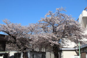 一方、中学校舎裏側、ごみ集積所の近くにある桜は満開です。