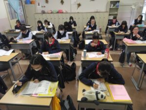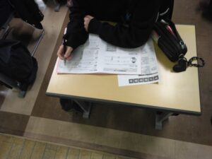 生徒たちは真剣な眼差しをしていました。その後は、模擬試験の注意事項の説明を受けました。試験範囲も配布されたので、やる気になっている生徒も多数いました。