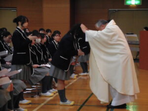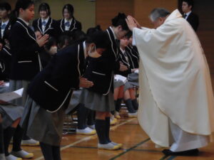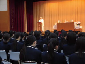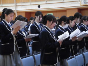 2026.04.23 中学入試関連 中学入試関連【高校一年生】新入生感謝のミサ4月23日(木)の午後、高校1年生はアリーナで入学感謝のミサに与りました。高校から入学した生徒たちの中には初めて体験する人もいましたが、ミサについて丁寧で分かりやすい説明がありました。ミサが始まると会場内に清らかな歌声が響きました。カトリック校である本校で高校生活3年間を送る生徒たち。その最初のミサに与った生徒たちが神の愛に守られて成長を遂げ、3年後、晴れ晴れとした表情で卒業感謝のミサに与ることができますよう、我々も祈っています。