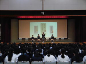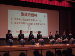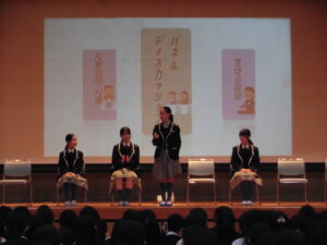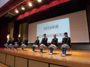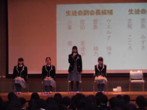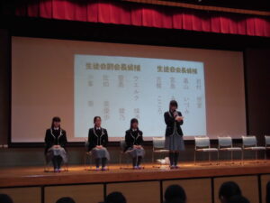 副会長候補である中学2年生は、壇上に立ち、それぞれが自分の思いや決意を力強く述べました。一方、生徒会長候補の中学3年生はパネルディスカッション形式で参加し、それぞれの考えや意気込みを語りました。