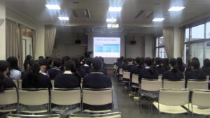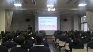 10月23日のLHRでは、キャリアプログラムとして、学年主任より前期の期末試験や、学力推移調査の結果をもとに、自分たちの成績を振り返って、どのような課題があるのかを認識し、後期の学習に役立てるべく、スライドを使ってのお話がありました。