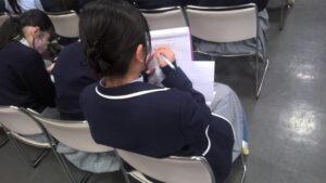 学年主任のお話にもありましたが、体育祭の応援合戦で結束力を見せたり、研修旅行の帰路、長い時間待ったときにも、くじけなかった学年の生徒たちです。人柄はすでに100点満点です。学習面でも、今より工夫や努力を積み上げることで、高校0学期となる今、さらなる高みへと飛躍することを期待しています。