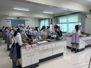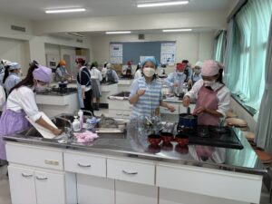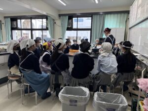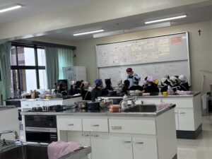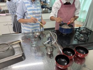 2025.11.12 ブログ 教科【中学1年生 技術・家庭】中学1年生の技術・家庭の授業では、入学時からみなが楽しみにしていた調理実習が始まりました。第1回目の実習は「みそ汁」です。かつおの一番だしのとり方、野菜の切り方やみそを入れるタイミングなど、和食の基本を学び、班のメンバーと協力しながら実習に臨んでいます。みんなで作って食べるお料理は本当に美味しく楽しい時間となりました。第2回の「しょうが焼き」も楽しみです。